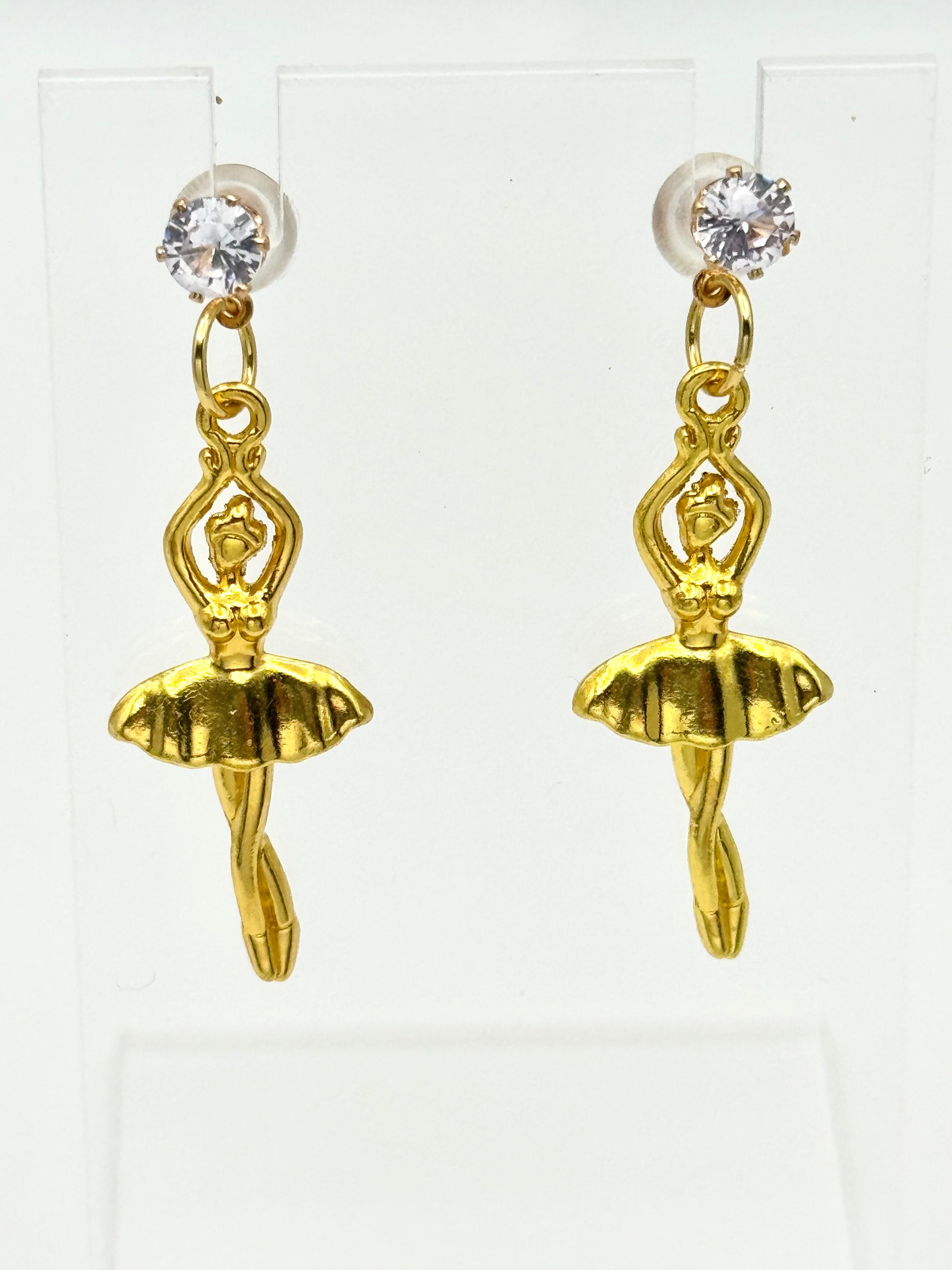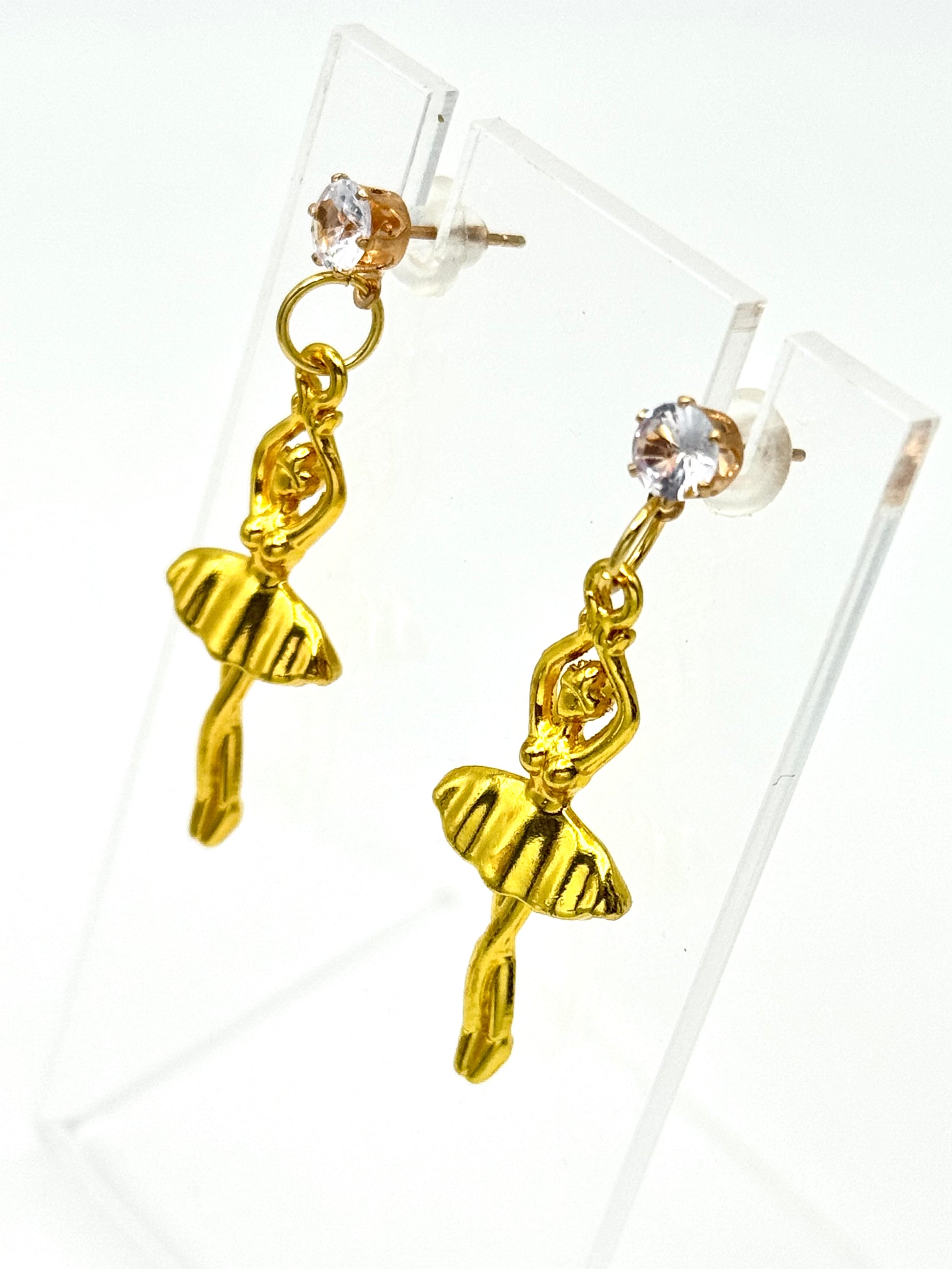 Short Description: A poised ballerina charm hangs gracefully from crystal-kissed gold studs — elegance made wearable.