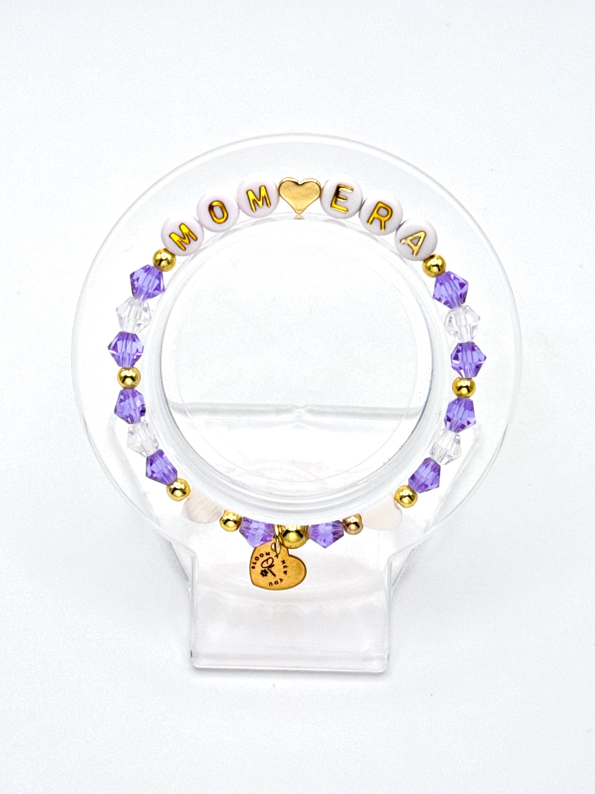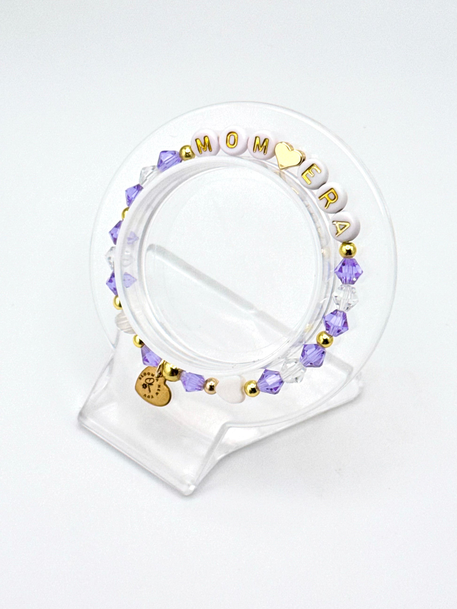 Inspiration: Celebrate your mom era with a touch of glam. Light purple and clear high quality crystal faceted beads give sparkle and movement, while white heart beads and gold spacers elevate the look. The gold “Mom Era” message with a gold heart center shows love, strength, and sparkle in one.