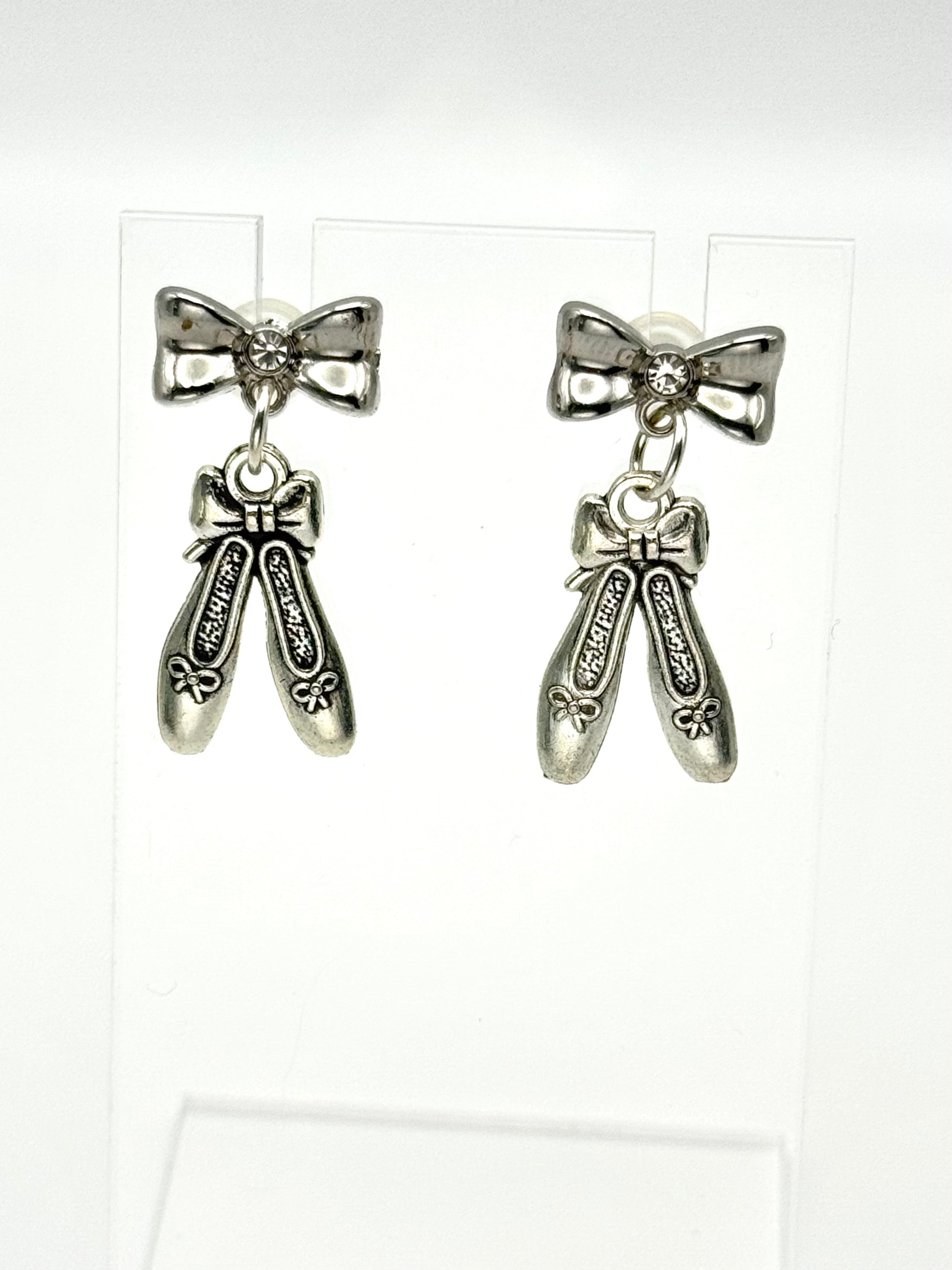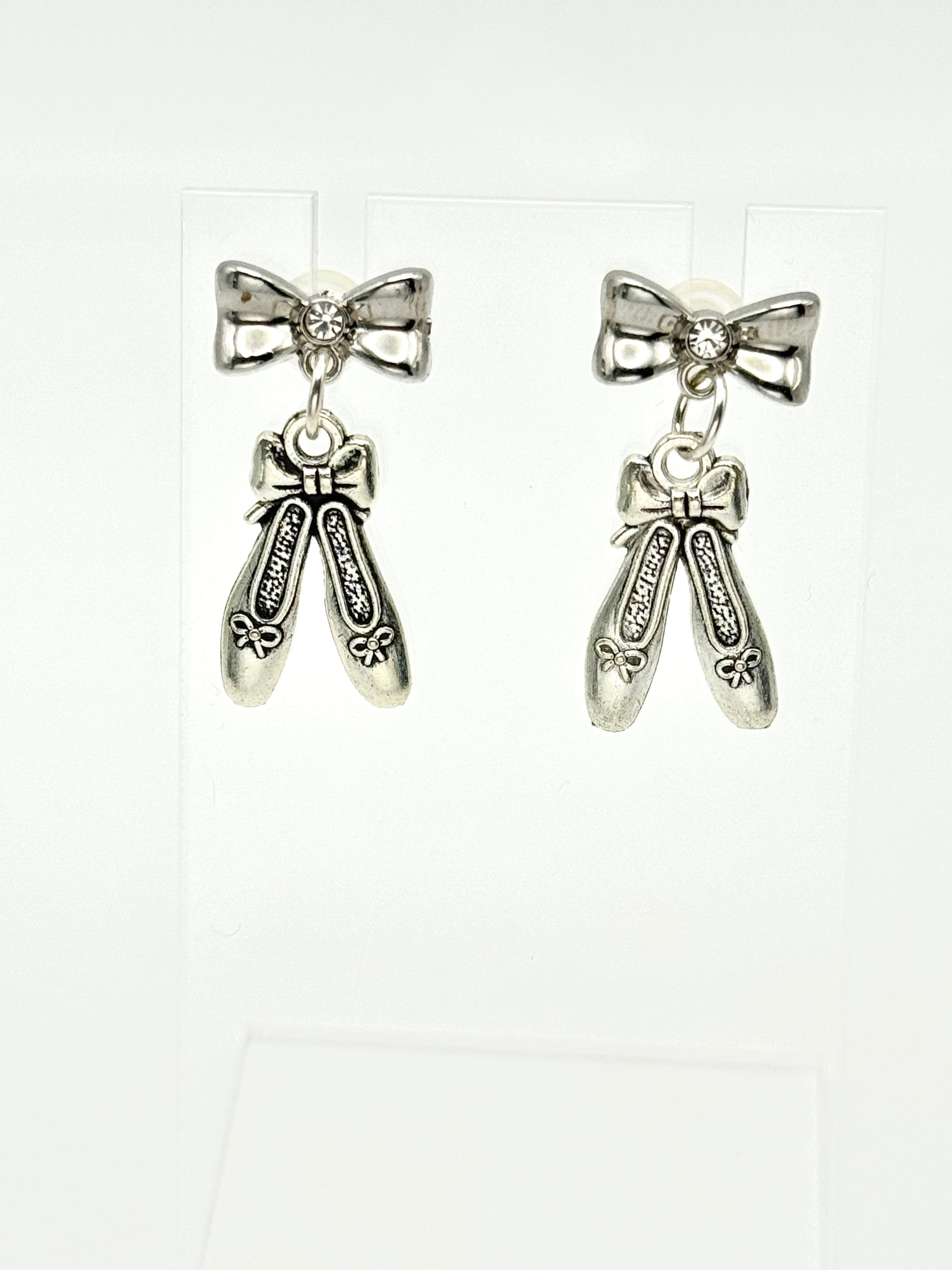 Full Description: Polished, poised, and full of grace — Silver Slippers captures the quiet elegance of the dancer’s ritual. With a dainty silver bow post and a tiny crystal stud at the center, each earring holds a pair of ballet slippers tied with perfect form.